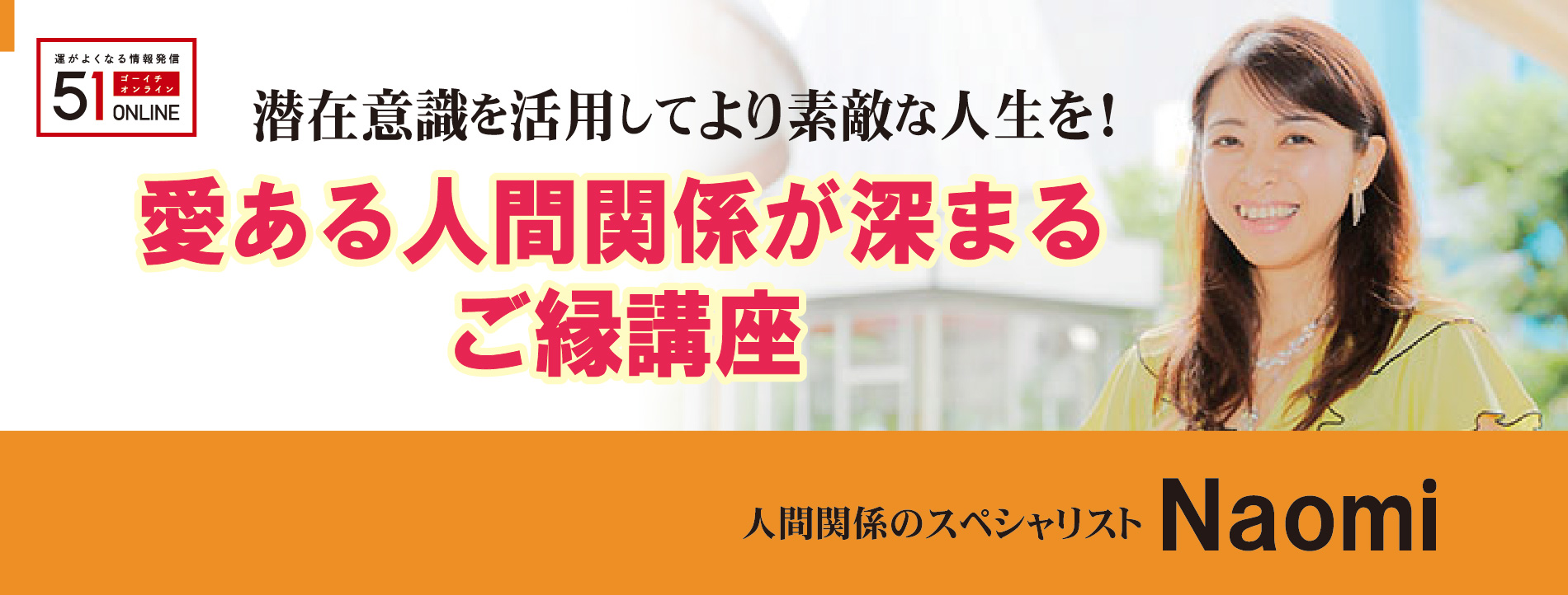 人間関係のスペシャリストNaomi先生が、映像でお届けする<ご縁の法則>や、<メッセージ>は、どのアドバイスも興味深いものばかりです。Naomi先生のご縁・人間関係の法則がギュギュと詰まったのが、「Naomiの愛ある人間関係が深まるご縁講座」です。